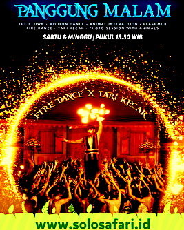 Khusus di hari Sabtu pada periode liburan sekolah, Panggung Malam Solo Safari juga menampilkan secara spesial Tari Kecak, kolaborasi antara Tari Kecak dan Fire Dance yang unik menyuguhkan pementasan spektakuler dan menciptakan atmosfer menegangkan serta magis di Panggung Terbuka Solo Safari, mengajak pengunjung tenggelam dalam suasana tradisional yang hidup, penuh energi dan tak terlupakan.
